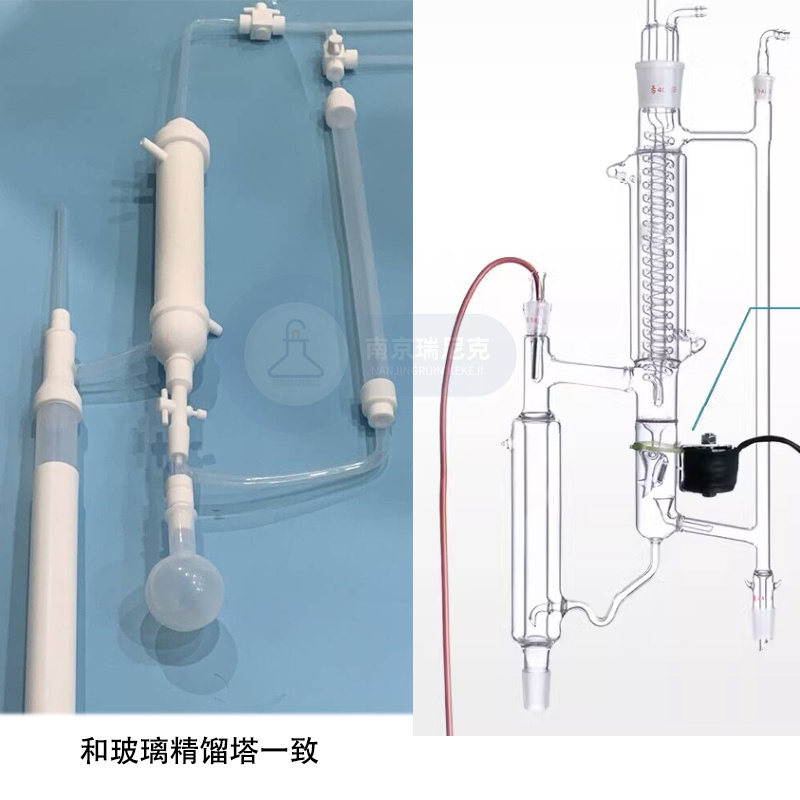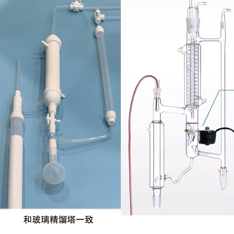 PFA系列產(chǎn)品 塑料PFA特氟龍精餾塔實(shí)驗室小試精餾裝置減壓蒸餾電加熱精餾柱精餾釜 材料:PFA 規格:PFA 描述:PFA精餾裝置-精餾柱PFA精餾柱是精餾塔的縮小版精餾是利用混合物中各組分揮發(fā)度不同而將各組分加以分離的一種分離過(guò)程其實(shí)作用就是分離過(guò)濾,客戶(hù)一般會(huì )在精餾柱中放高效精密填料也叫填充物,以實(shí)現待分離組分的分離提純,精餾柱的底部也會(huì )放篩板進(jìn)行過(guò)··· 產(chǎn)品詳情 PFA精餾裝置-精餾柱PFA精餾柱是精餾塔的縮小版精餾是利用混合物中各組分揮發(fā)度不同而將各組分加以分離的一種分離過(guò)程其實(shí)作用就是分離過(guò)濾,客戶(hù)一般會(huì )在精餾柱中放高效精密填料也叫填充物,以實(shí)現待分離組分的分離提純,精餾柱的底部也會(huì )放篩板進(jìn)行過(guò)濾到燒瓶中加熱進(jìn)行下一步的反應。燒瓶進(jìn)行加熱,產(chǎn)生的氣體和液體在精餾柱中過(guò)濾反應,氣體會(huì )蒸發(fā)到頂部過(guò)到冷凝中進(jìn)行冷凝過(guò)濾后的液體流到燒瓶中繼續反復加熱 蒸發(fā) 過(guò)濾 最終冷凝。目前市場(chǎng)上多用到的是玻璃精餾柱,目前我公司生產(chǎn)的是PFA精餾柱,可耐受氟化氫和氫氟酸,耐受有機溶劑,各種尺寸均可定制產(chǎn)品名稱(chēng):特氟龍過(guò)濾柱產(chǎn)品簡(jiǎn)介:利用高度差填充物過(guò)濾樣品,通常是反應物有氟化氫或者氫氟酸,采用塑料特氟龍材質(zhì)過(guò)濾柱,也有叫精餾柱,一般用于小實(shí)裝備。材質(zhì)一般選擇PFA/PTFE材質(zhì),PFA材質(zhì)是透明可以看見(jiàn)內部反應,本底值純凈,PTFE純白不透明,無(wú)法看見(jiàn),但是耐壓性?xún)?yōu)于PFA材質(zhì),根據實(shí)驗要求選擇定制材質(zhì)和尺寸,通??梢詭讉€(gè)過(guò)濾柱一起連接反應,也可以單獨配套反應瓶等設備做精餾塔小實(shí)反應。產(chǎn)品特點(diǎn):耐酸堿耐腐蝕,本底值低,不會(huì )污染樣品,可以定制加工,多個(gè)連接。應用行業(yè):新材料半導體行業(yè)